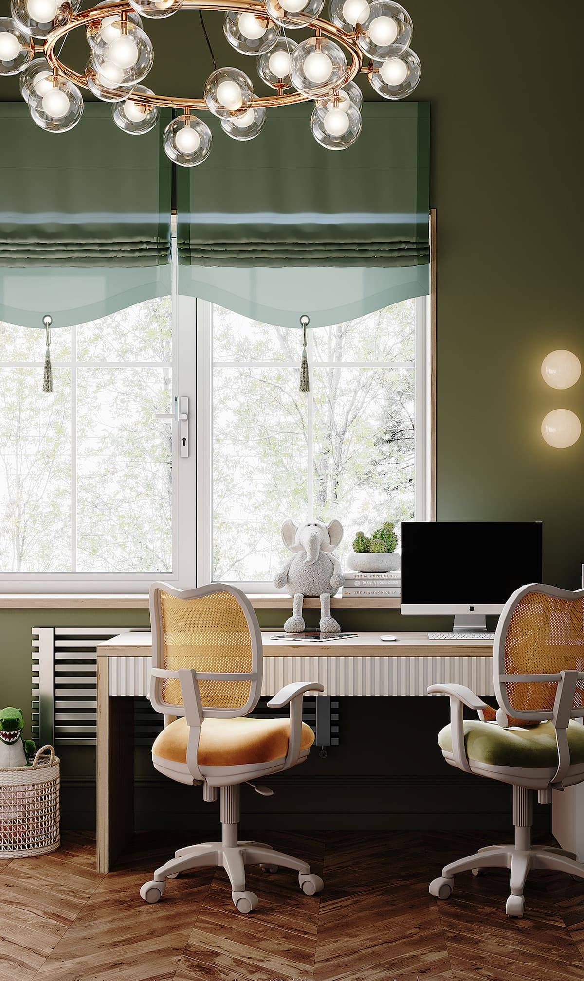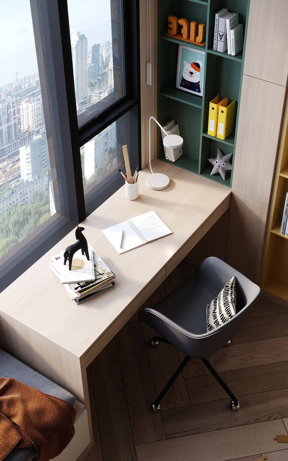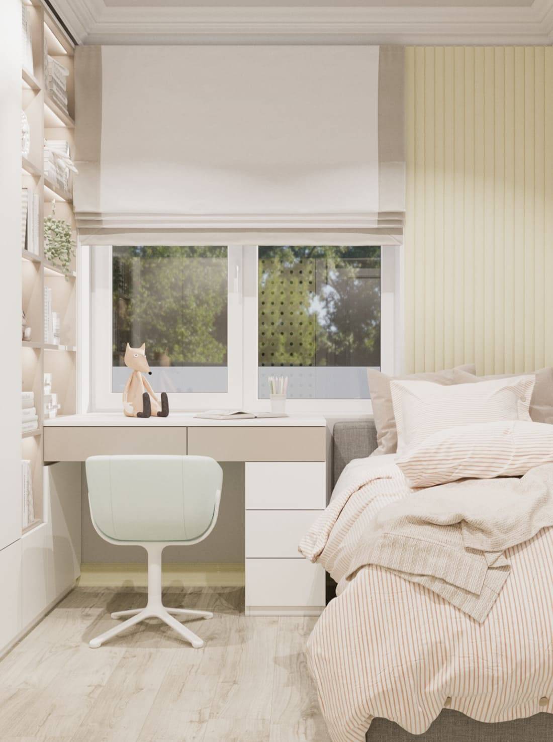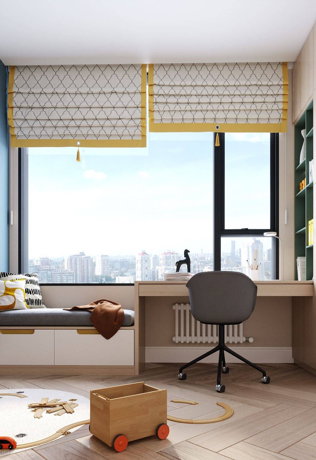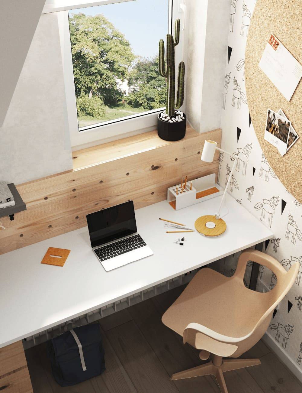 Наиболее удобным вариантом для большинства детских комнат является письменный стол, расположенный вдоль окна. В идеале его столешница тянется от одной стены к другой, предоставляя детям большое пространство для занятий. Стандартные модели могут не подойти, поэтому понадобятся услуги мебельных компаний. Подоконник окна можно заменить наращенной столешницей.