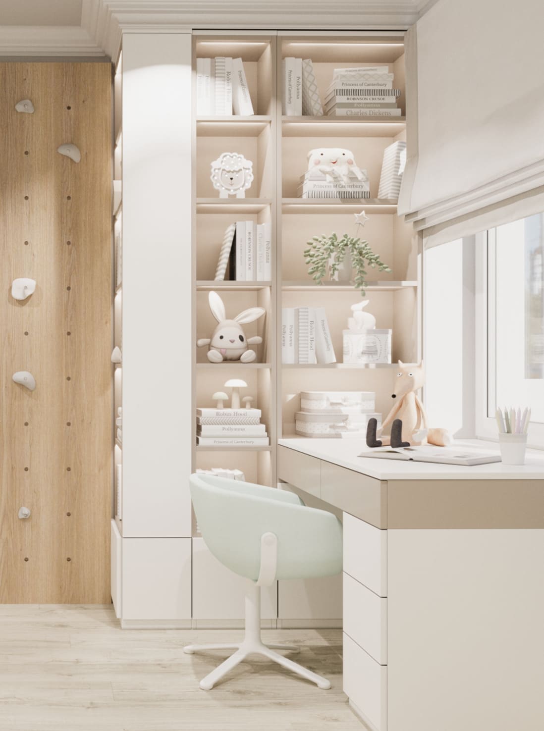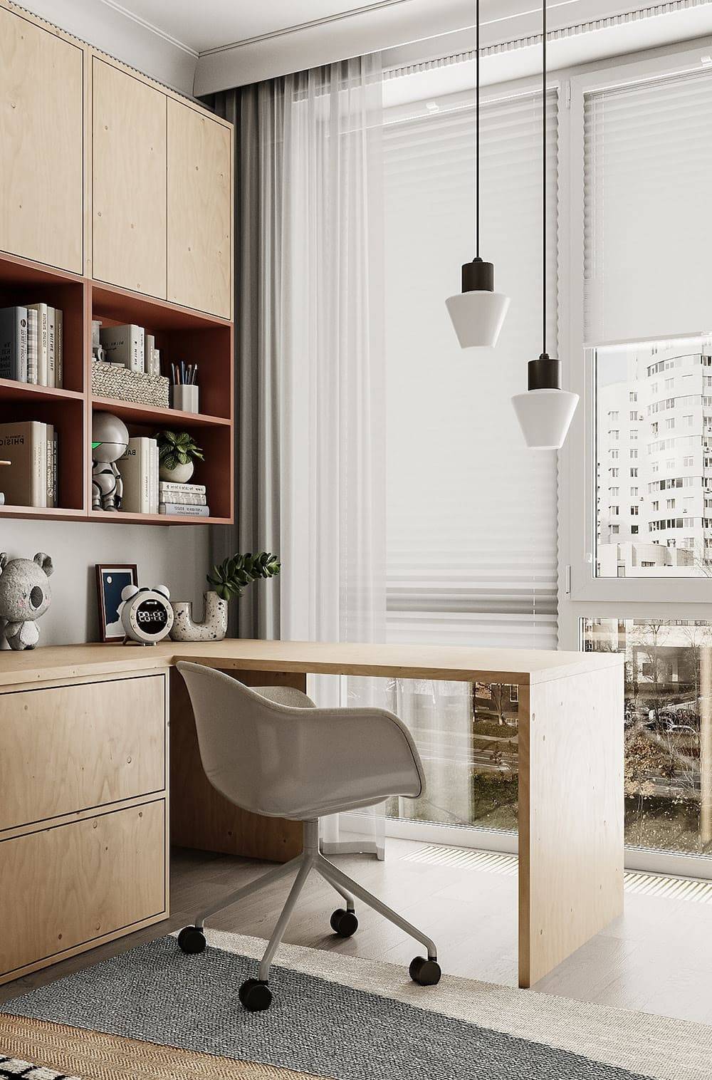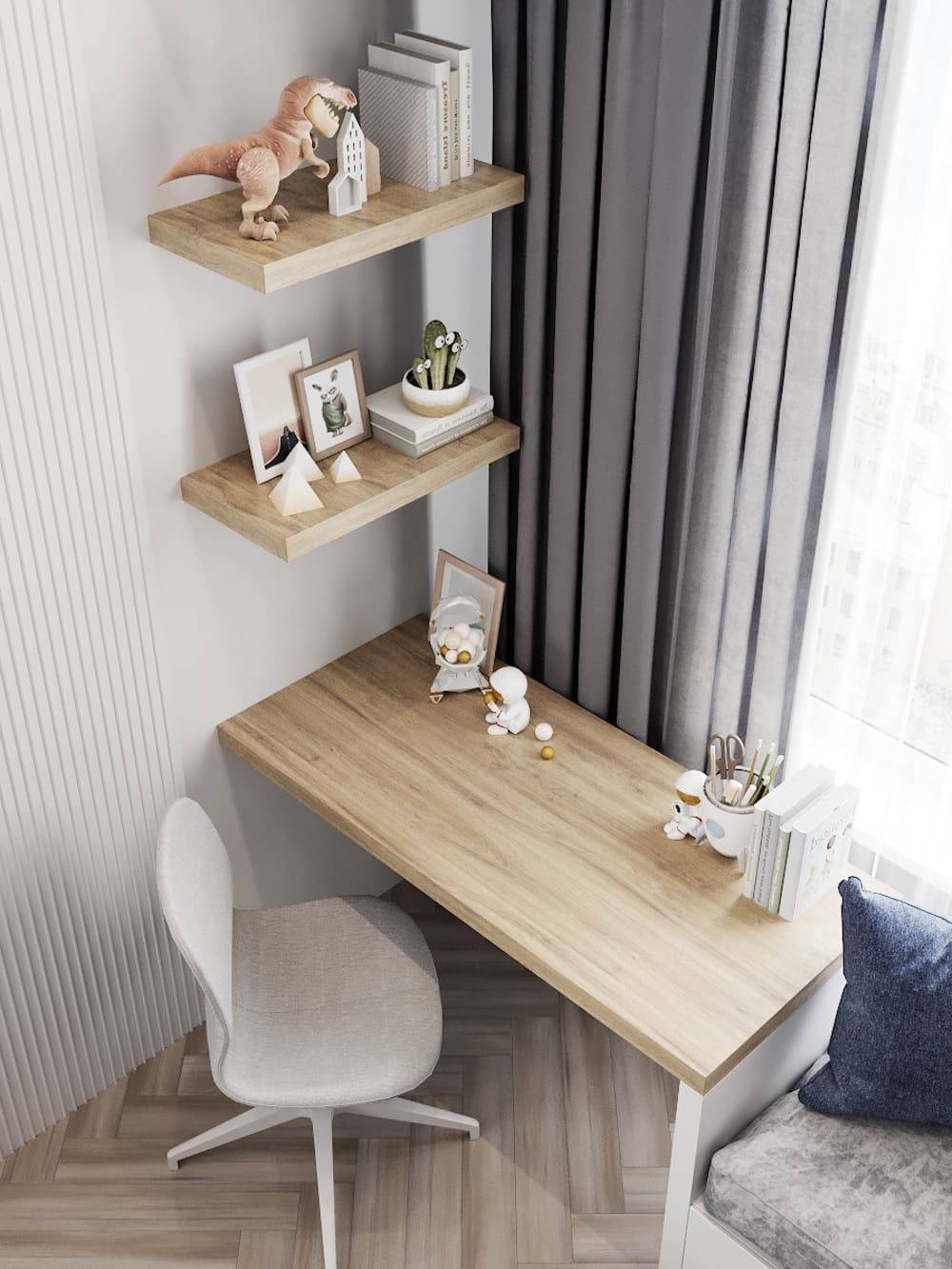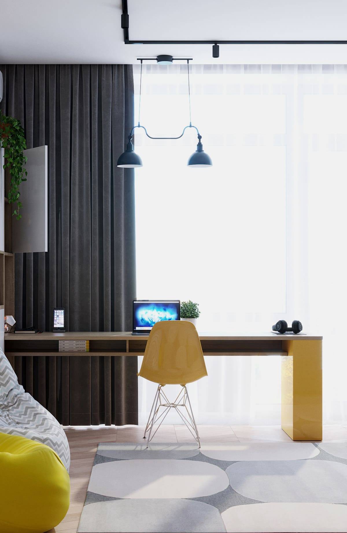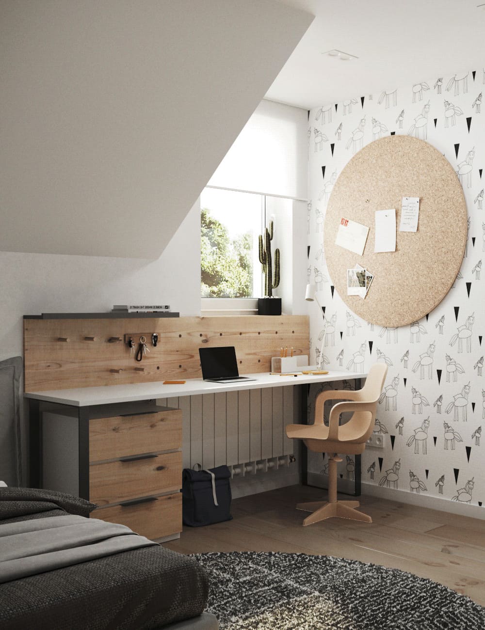 Наиболее удобным вариантом для большинства детских комнат является письменный стол, расположенный вдоль окна. В идеале его столешница тянется от одной стены к другой, предоставляя детям большое пространство для занятий. Стандартные модели могут не подойти, поэтому понадобятся услуги мебельных компаний. Подоконник окна можно заменить наращенной столешницей.