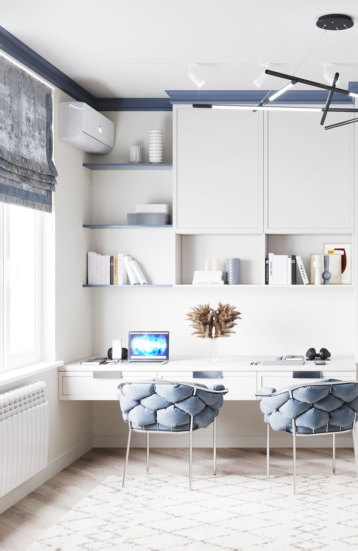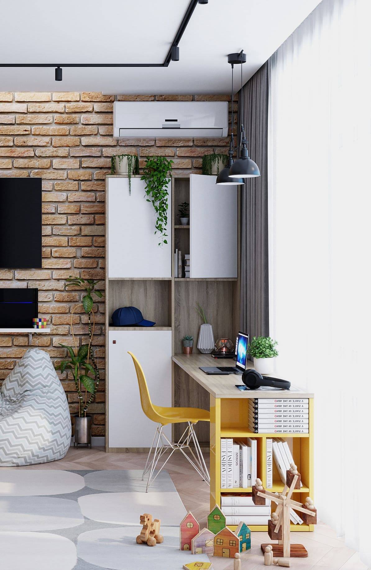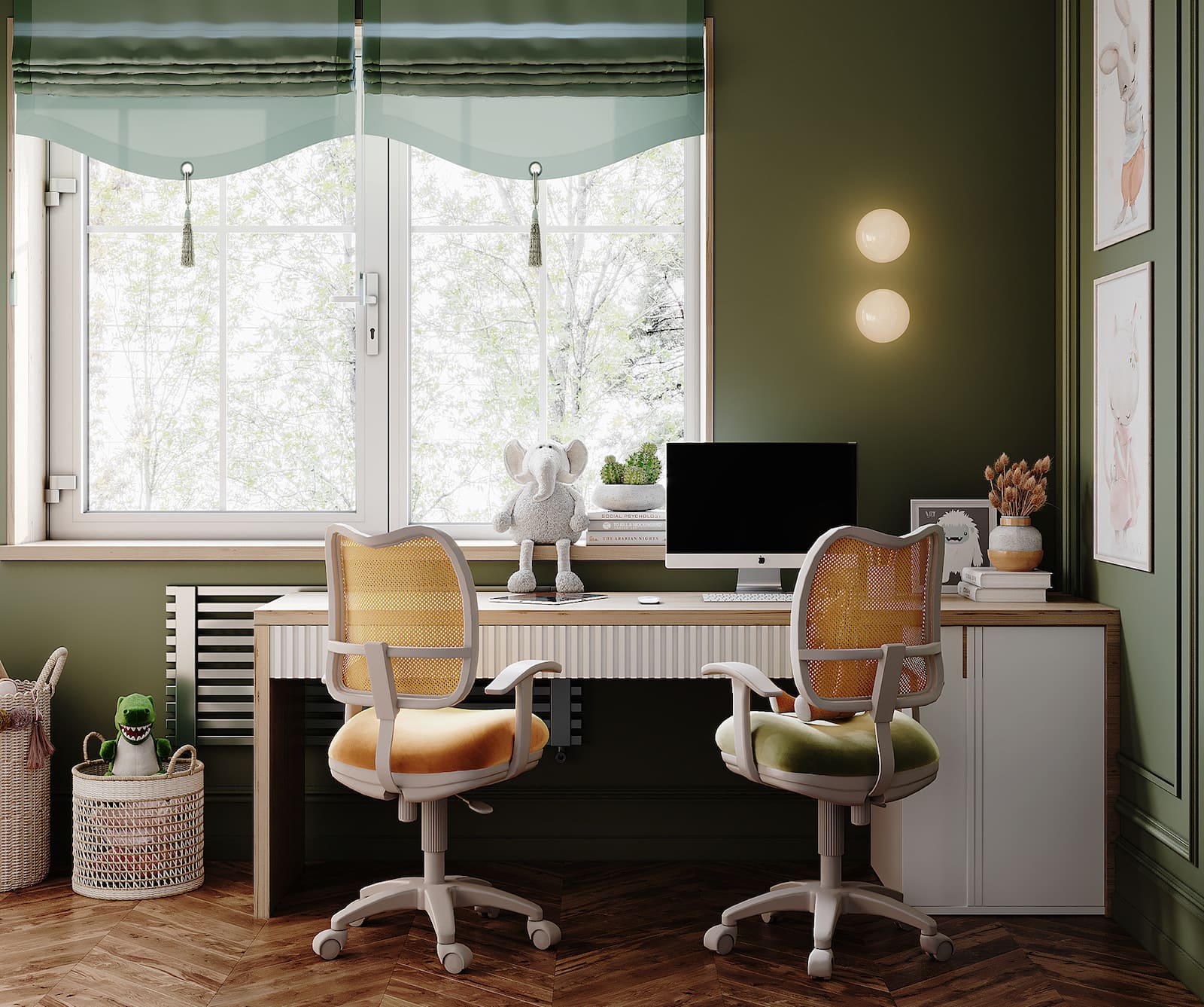 Чтоб не возникало вопросов и скандалов из-за того, чья очередь сидеть у компьютера, необходимо каждому обустроить рабочую зону с двумя отдельными устройствами. В этой зоне должен располагаться компьютер, стол письменный, место для хранения книг и тетрадей. Вовсе не обязательно ставить большой стол каждому ребёнку. На сегодняшний день многие предпочитают использовать модульную систему, в которой нижним ярусом является рабочее место, а вторым ярусом спальное. Это значительно экономит полезное пространство и оставляет больше места для других зон.
