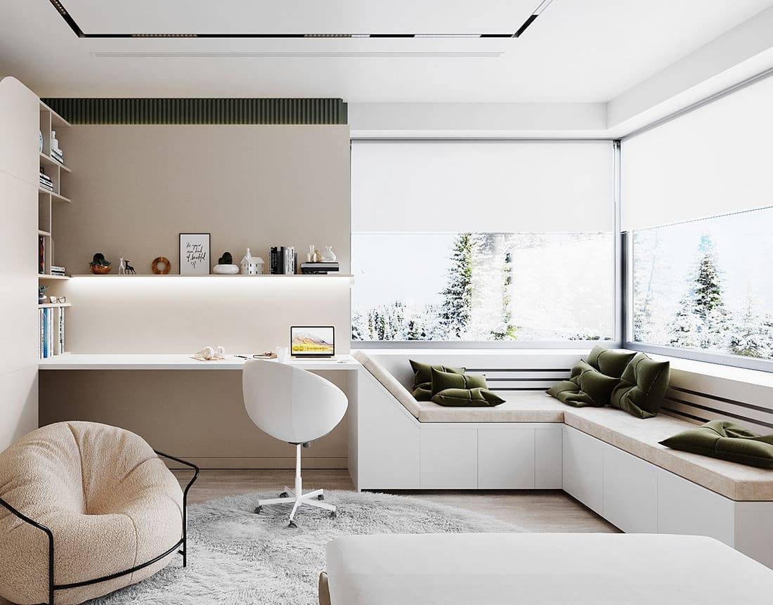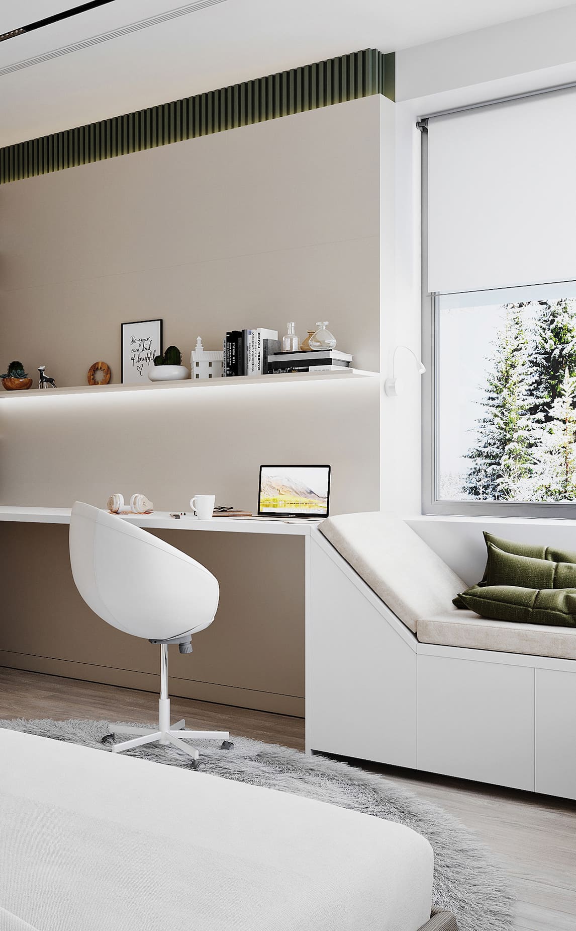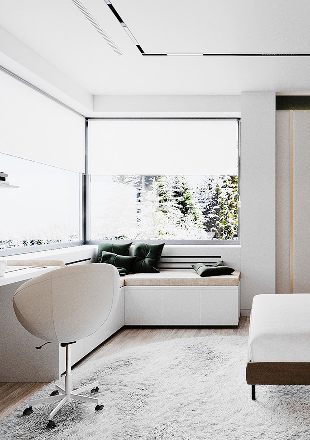 Модель встроенного типа, имитирующая диван-подоконник, в зоне отдыха спальни.