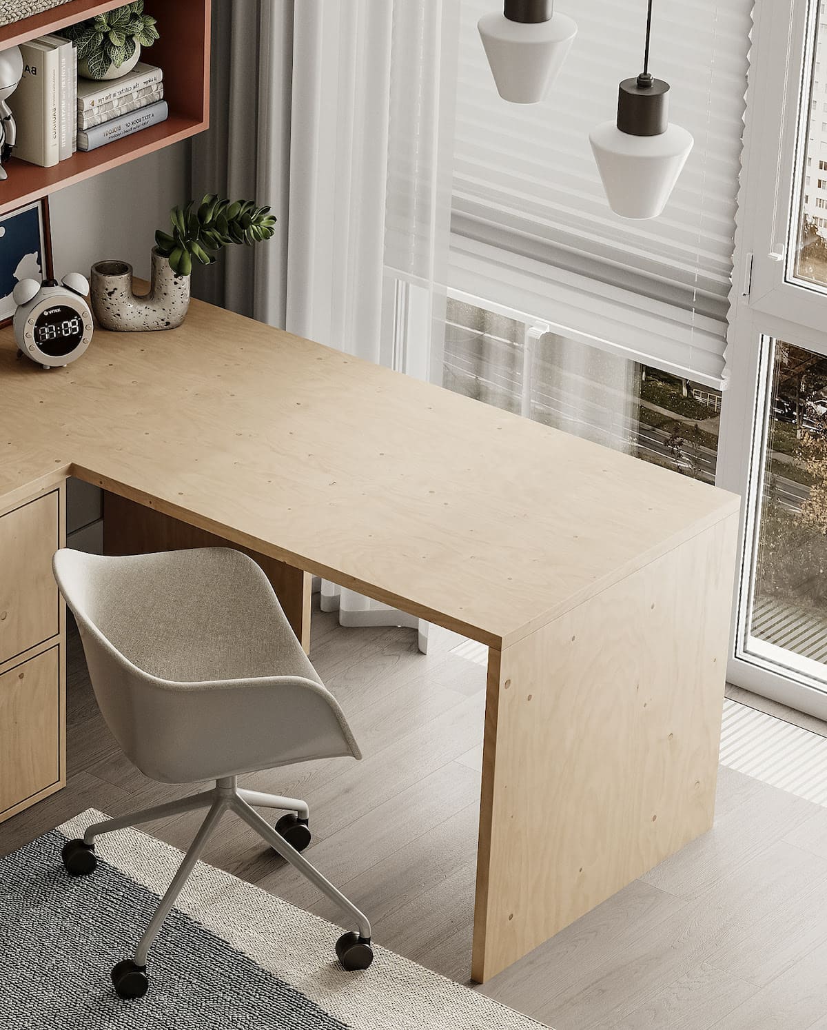 Если площадь комнаты позволяет, то можно выбрать угловой стол, где обе столешницы имеют одинаковые размеры.