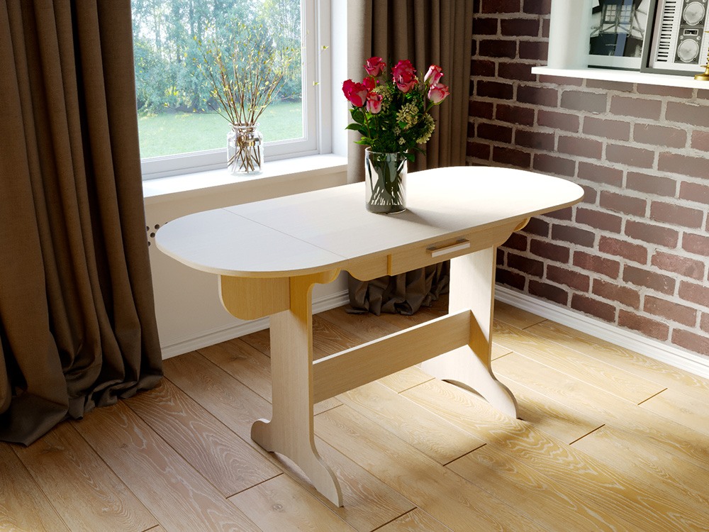 На функциональность, практичность мебели влияет конструкция. Столы бывают цельными, раскладными. Небольшим монолитным изделием оборудуют тесные кухоньки, чтобы сохранить свободное пространство. Если площадь позволяет, то покупают стол-книжку, оснащенную раскладной столешницей, выдвигающимися ножками. Специальная конструкция обеспечивает увеличение размера изделия. У некоторой мебели она спрятанная, выдвигается нажатием на встроенный механизм. Собранный раскладной стол при разложении становится большим. Если вокруг квадратной формы такого же размера умещается 4 постояльца, то около овально – 6-8.