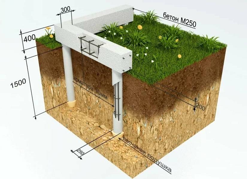Заглубленные обустраиваются ниже уровня промерзания, примерно, на глубину 1,5-2 м. Именно этот тип оснований подходит для мест с подвижным грунтом. Расстояние между столбами делается от одного до двух метров.