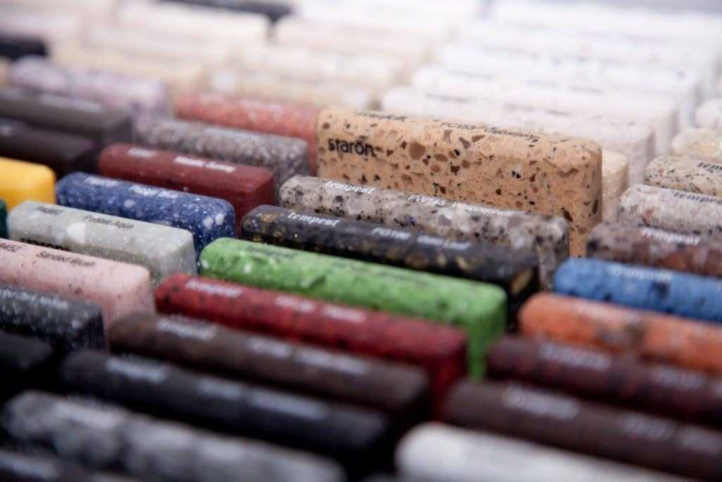 По своим характеристикам кварцевый камень лучше, с экологической точки зрения и по свойствам. Акрил более экономичный вариант. Для разнообразия дизайна, многие фирмы предлагают услуги колористов. Можно добавить в материалы каменную крошку разных цветов, блестящие частицы или материалы, смягчающие взаимодействие с предметом.