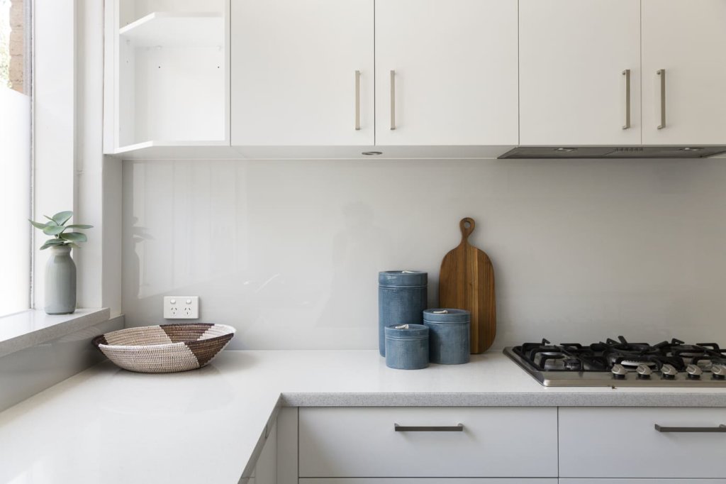 Для столешниц белого цвета, лучше камень выбирать, обладающий прочностью и пониженную пористость. Для этого идеально подходят агломерат и кварцит. Светлая столешница визуально увеличивает размеры гарнитура, а кухня становится изящной и богатой. Зачастую белые столешницы разбавляют гранитом, минеральной крошкой, создают имитацию мрамора. Это облегчает процесс уборки, и делает поверхность более практичной в использовании.