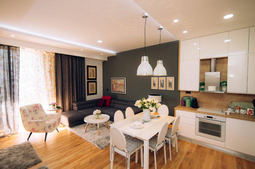 Тяжелое шикарное полотно из плотной материи – не самый практичный выбор для помещения, где готовят и принимают пищу. Если вся квартира выдержана в стиле барокко, арт-деко или классика, уместней использовать французские гардины, а не массивные полотна. За портьерами тяжело ухаживать, а тканевые складки активно собирают пыль.