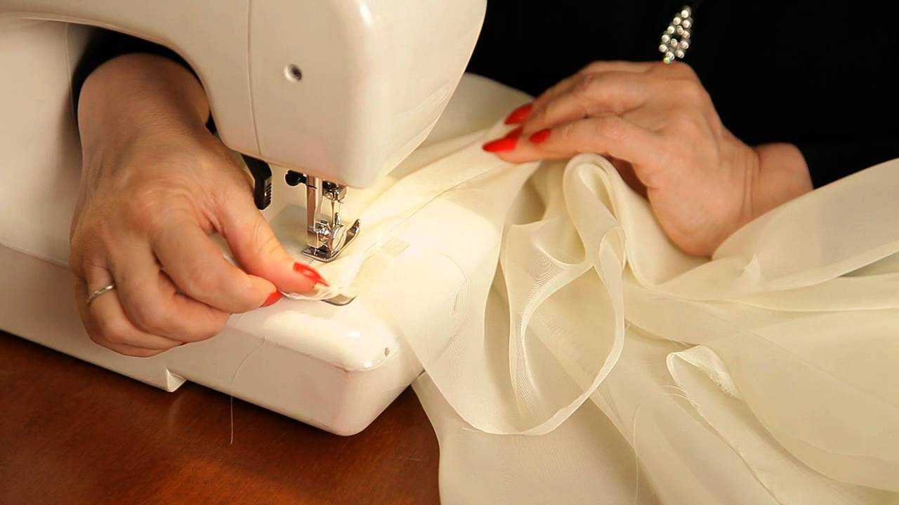 Для начала отрезают тюль согласно выкройки. Чтобы убрать лишнее, достаточно вытянуть нить и обрезать по ней. Боковые срезы закрывают.