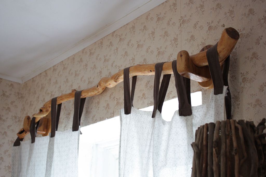 - Сухая ветка. Необычный способ монтажа штор. Сухая коряга окрашивается в подходящий цвет и с помощью гвоздей монтируется к торцу окна. Гардина вешается на деревянную конструкцию. Выглядит такой метод необычно и стильно.