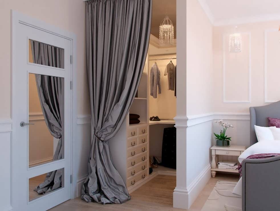 - Если вы организовали в спальной комнате гардеробную, при этом пожертвовав размерами спальни, лучше не использовать глухие дверные полотна. Оставьте проем без дверей, а мы научим, как его красиво обыграть.