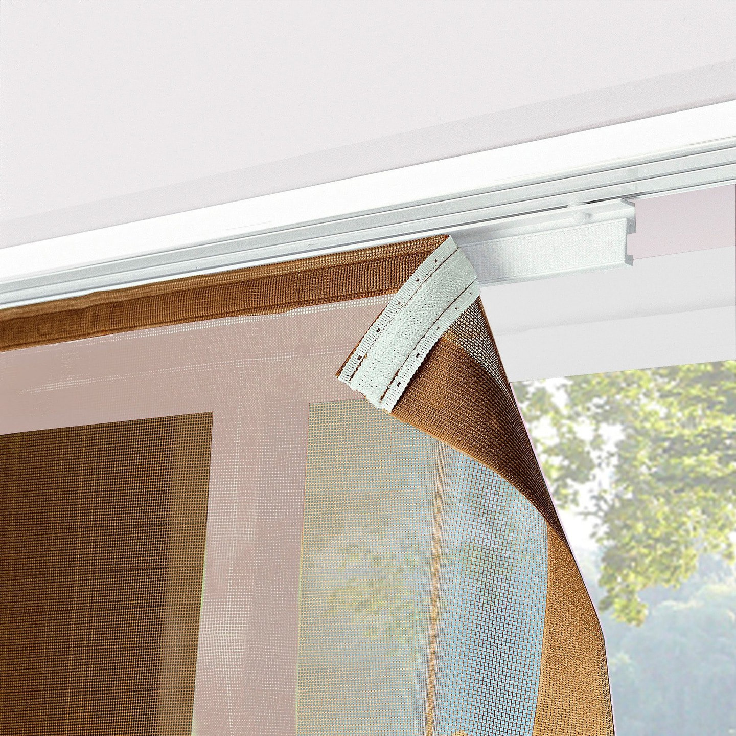 Каждая полоса представляет собой профиль с перемещающимися роликовыми бегунками в желобе, нижняя часть которых заканчивается общей планкой. Именно к таким планкам крепится твердая лента текстильной застежки, к которой присоединяется мягкая лента, пришитая к полотну ткани. Липучка обеспечивает плотное и надежное прилегание по всей ширине полотна при движении панелей. Часто для того, чтобы закрыть движущиеся планки и раздвижной механизм от посторонних глаз, на лицевой край карниза с помощью липкой ленты крепится ламбрекен или декоративный багет.