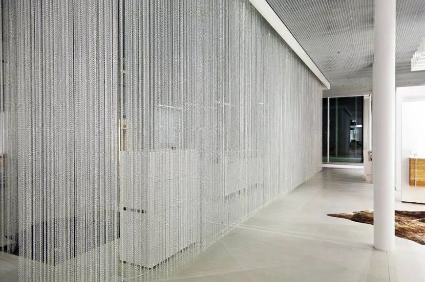 Драпировки с бусинами воссоздают орнаменты, части изображений, которые можно соединить в единое целое. Решение актуально в этно-стиле и в течении хай-тек. Гардины из ниток со стеклярусом показывают геометрический рисунок. Сооружение очень тяжелое, поэтому для монтажа используют надежные карнизы.