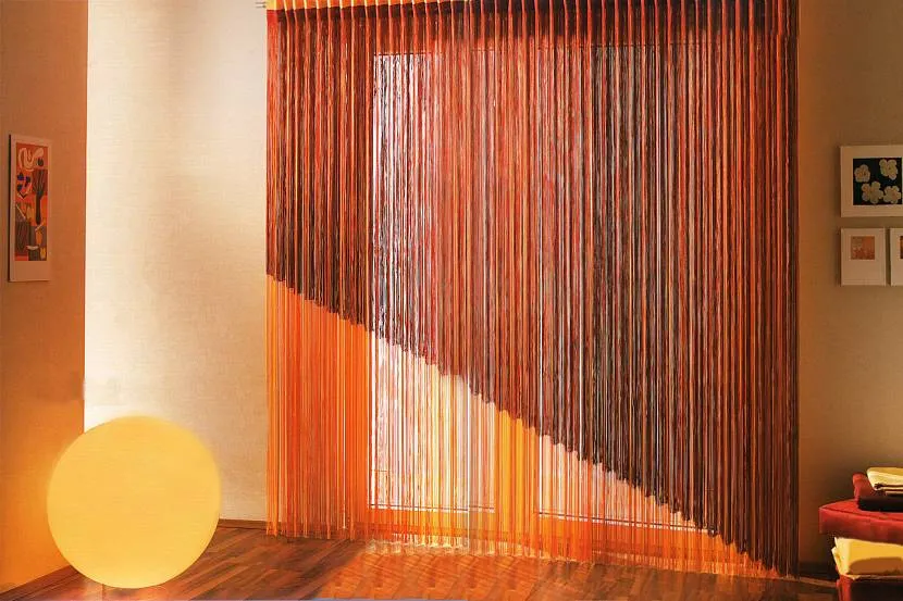 Веревочные шторы делают из вискозы, полиэстера или ацетата. В качестве декора используют элементы из камней, бусин или люрекса. Конструкция напоминает ниспадающий каскад или вертикальные жалюзи с поворотным механизмом. Модели используют для дверных проемов или зонирования помещений.