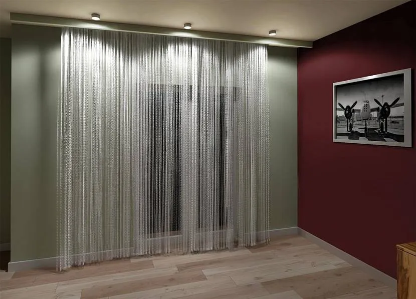 Длинные вертикальные ниточки способствуют созданию эффекта высокого потолка, что особенно выгодно для маленького помещения.