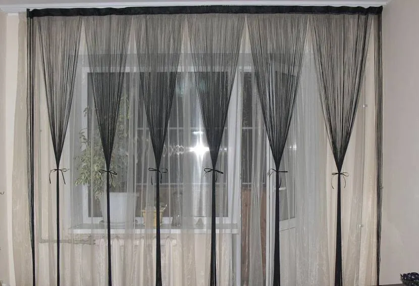 В нынешнем сезоне рекомендуется выбирать шторы нити бежевого, оливкового, серого, сиреневого и других благородных тонов. В таком оформление ваша квартира будет выглядеть модно и стильно. Простые черные нитяные шторы — вечная классика, которая помимо шикарного вида обеспечивает защиту от солнца и приватность.