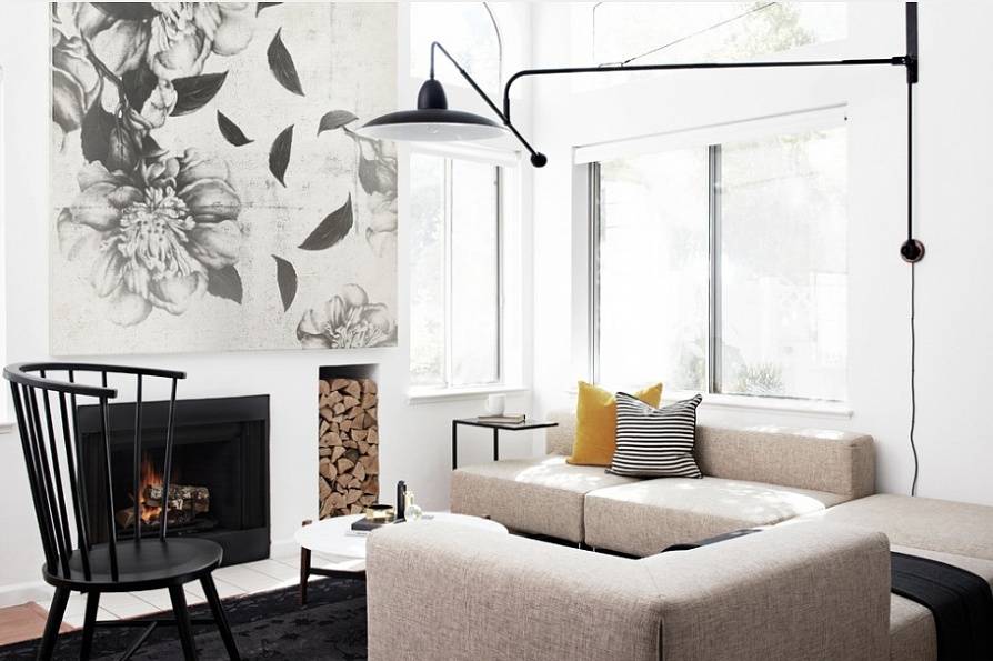 - контрастировать: сливочные гардины на петлях и узкий черный карниз.