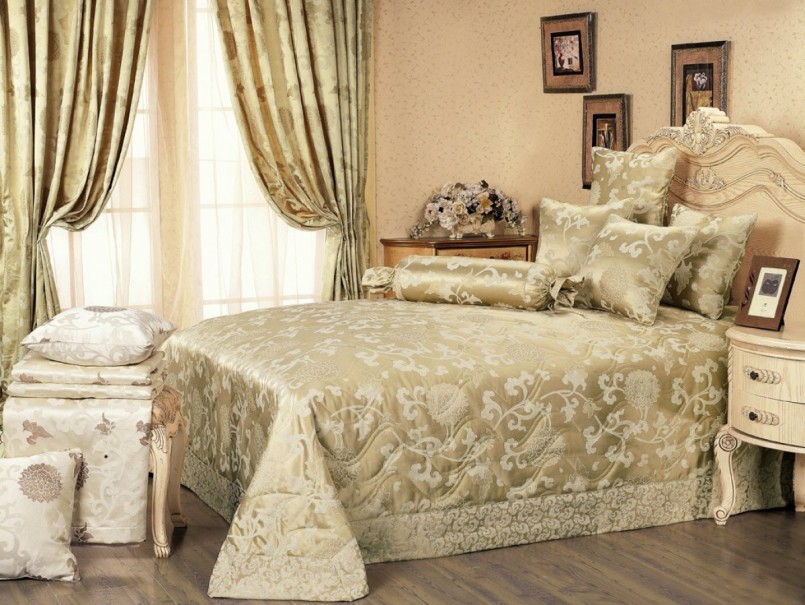 На фото интерьер спальни с шелковыми портьерами, которые по материалу и цветовой гамме сочетаются с текстилем кровати.