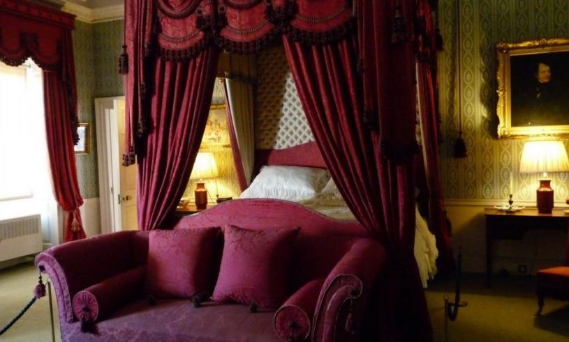 Комната в стиле будуар, бордовые шторы с ламбрекеном, бордовое покрывало плюс золото ренессанса.