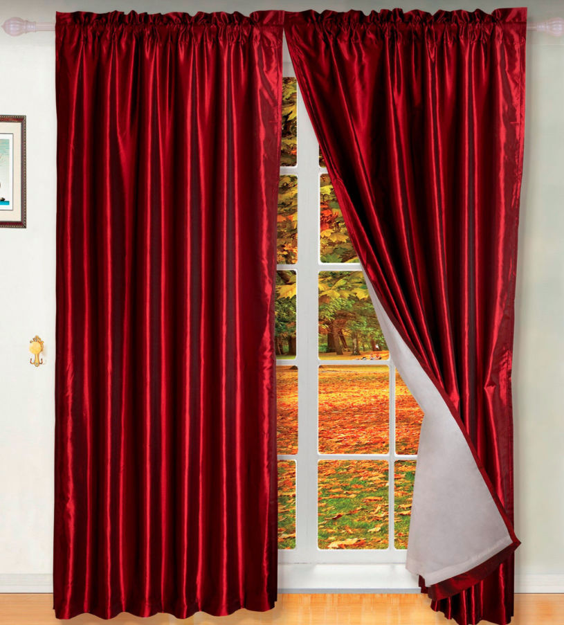 - Шёлк всегда выглядит роскошно и элегантно. Мягкая драпировка придаёт оконному проёму лёгкость и воздушность. Но яркие цвета шёлковых тканей без защиты блекнут на солнце. В качестве альтернативы для гардин используется тафта. Она хорошо защищает от яркого света и сохраняет первозданный вид после стирки.