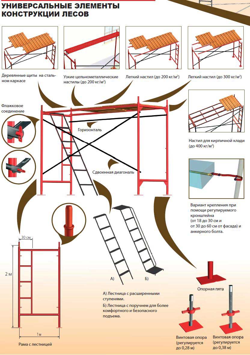 Несмотря на большое разнообразие видов строительных лесов, их конструкции содержат одинаковые по назначению элементы: