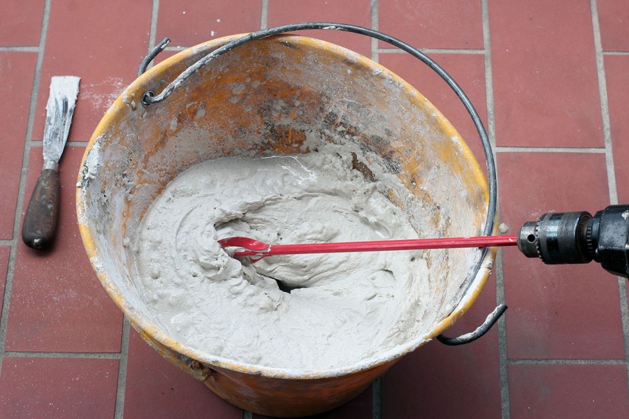 В сухую массу добавляют воду, интенсивно перемешивая с помощью дрели с насадкой. Результатом будет однородная серая смесь сметанообразной консистенции.