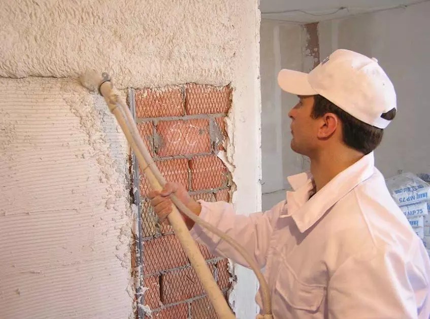 Гипсовую смесь наносят как бы намазывая, так как она имеет большую эластичность и пластичность. Однако процедуру можно проводить машинным методом, что существенно увеличивает производительность. В данном варианте смесь подается под определенным давлением к основанию стены, что гарантирует качественную адгезию. Но от ручного разглаживания правилом никуда не деться.