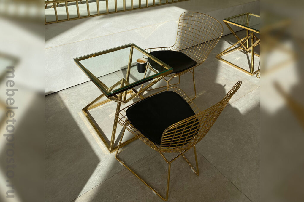 В качестве внешней отделки стула, как правило, используется зеркальный хром или порошковая краска различных оттенков. Например, очень эффектно выглядят стулья Bertoia, декорированные под «золото».