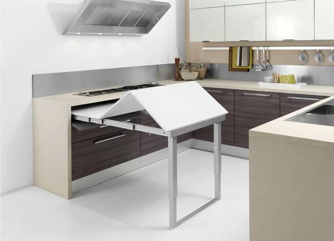 Современные маленькие комнаты для приготовления пищи требуют инновационных решений для небольшого кухонного стола. Выдвижные панели и подвижные столешницы, спрятанные в нижней части настенного буфета, дают неограниченные возможности использования. Идеальное решение для семейной трапезы, дополнительных гостей на кухне.