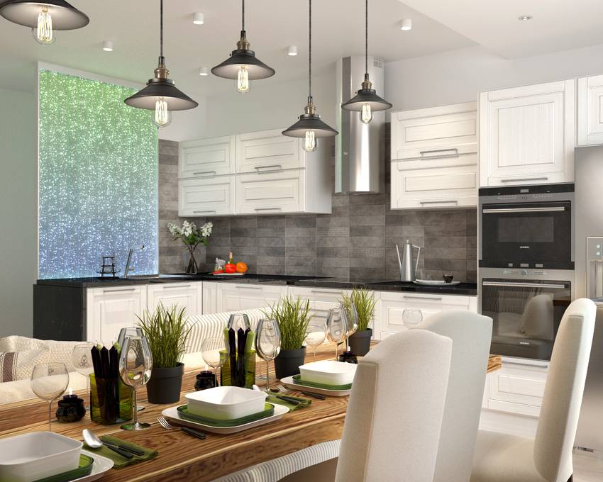 - Планировать схему освещения кухни нужно до ремонта. Лучше всего делать это на этапе, когда уже определено расположение рабочей зоны, обеденного стола и зоны хранения.
