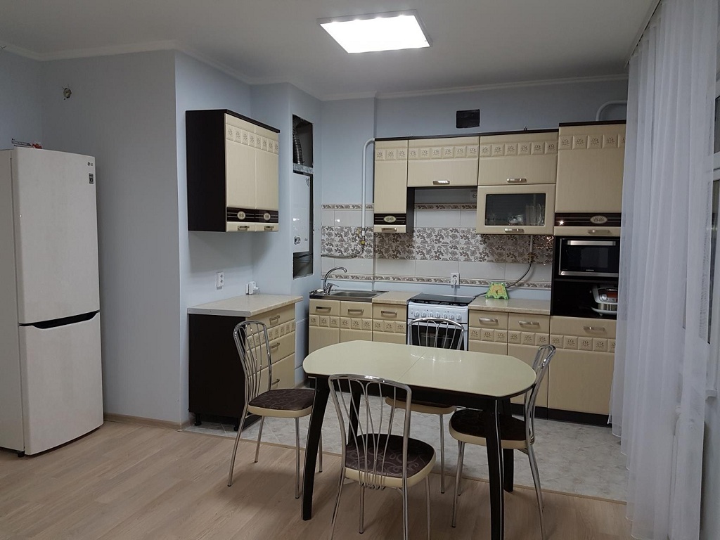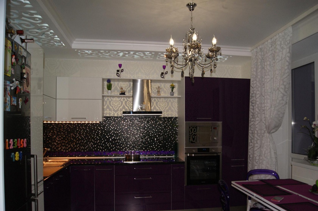Для кухонного пространства с потолком, оформленным глянцевым натяжным полотном идеально подходят модели, оснащенные с помощью нескольких открытых светодиодных лампочек. Зеркальное покрытие будет отражать мерцание ламп, за счет чего получится добиться очень интересного эффекта.
