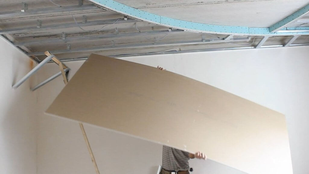 - Потолок представляет собой листы гипсокартона (ГКЛ) на одном или нескольких уровнях.