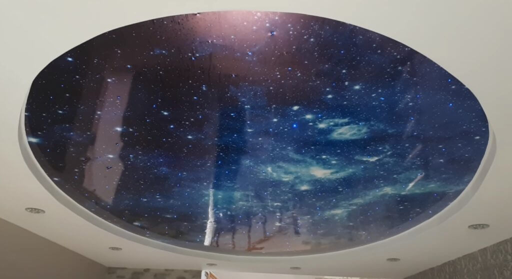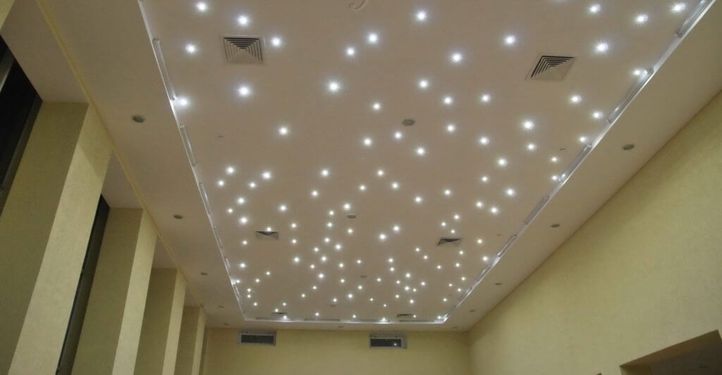 Для натяжных потолков описанный метод не подходит, поэтому для создания звездного неба рекомендуется использовать оптоволокно. Все работы проводятся непосредственно до полного натяжения материала: