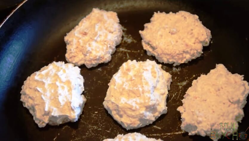 - Из соленого творожного теста лепим небольшие оладушки и обваливаем их в муке;