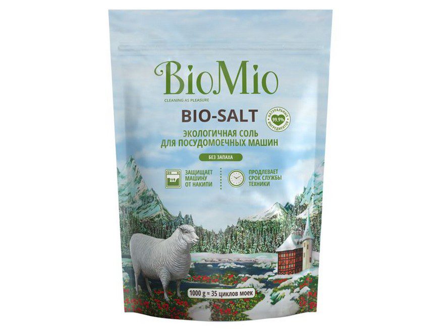 Средство, которое продолжает линейку биоразлагаемых средств от этого производителя. Продается в мягких паучах объемом 1000 граммов, такого количества хватает на месяц ежедневного использования посудомоечной машины. Соль Bio-Salt предотвращает образование известкового налёта на посуде и скапливание накипи в посудомоечной машине. Происходит смягчение воды и усиление воздействия моющего средства. Подходит для любой посуды и для машин любого типа, в составе нет отдушек, красителей и вредных для здоровья человека веществ, в том числе тех, что могут вызвать аллергическую реакцию.