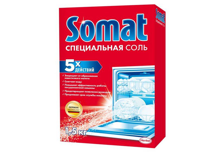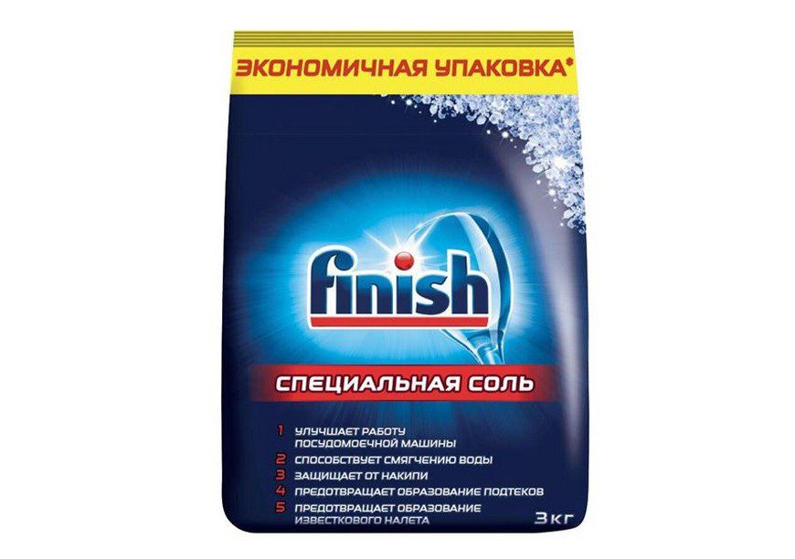 Соль для посудомоечных машин, смягчающая воду и усиливающая действие моющего средства. Продается в картонных коробках массой 1 килограмм, предотвращает появление разводов на посуде. За счет того, что производитель предпочитает использовать крупные кристаллы, это средство долго растворяется в воде, а значит, и расход у него очень экономный. Никаких кальциевых отложений на стенках и деталях посудомоечной машины, при этом соль не содержит таких примесей, как железо и карбонад, которые могут повредить блок умягчения воды.