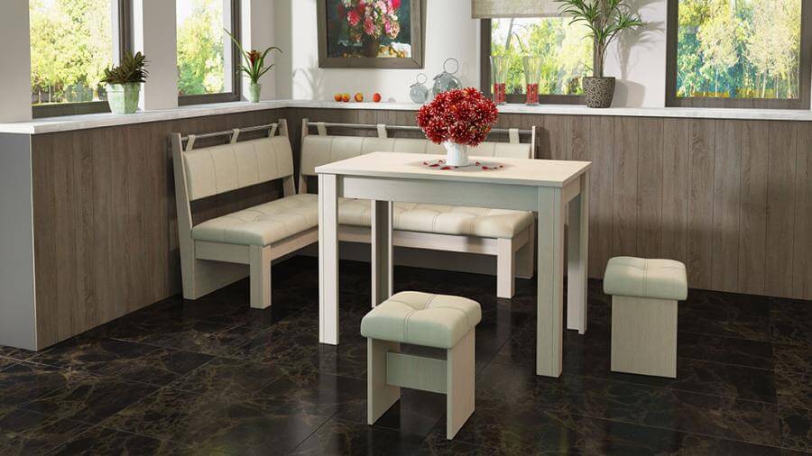 В небольшой кухне лучше разместить табуреты. Они представляют собой обычное сидение на четырех ножках. Бывают модели на трех опорах или со сплошным основанием. У таких стульев нет спинки, поэтому они легко прячутся под стол, не занимая много места. Особенно удобны, когда обеденный стол используется в качестве рабочей поверхности. Табуреты устойчивы и надежны, хорошо сочетаются с любым интерьером.