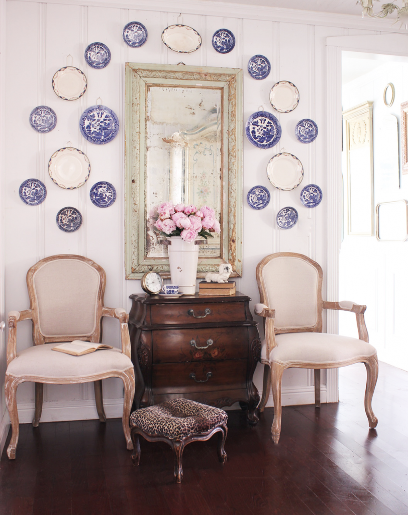- Можно украсить всю пустующую стену, равномерно распределив на ней блюдца.
