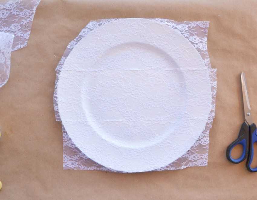 Вырезаем из плотной ткани прямоугольник или кружок, прикладываем к тарелке канцелярскую скрепку и обильно «поливаем» горящим клеем. Затем сразу же прикладываем вырезанный кусочек ткани и сильно прижимаем к поверхности тарелки.