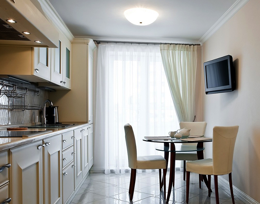 Тв-устройство одинаково хорошо просматривается из всех точек кухонного помещения и занимает минимальное количество площади. Единственный минус, который может возникнуть при угловом расположении — это свет, идущий от окна. Во избежание таких неудобств, телевизор перевешивают в другой угол кухни или оформляют оконный проем с помощью жалюзи или плотных штор.