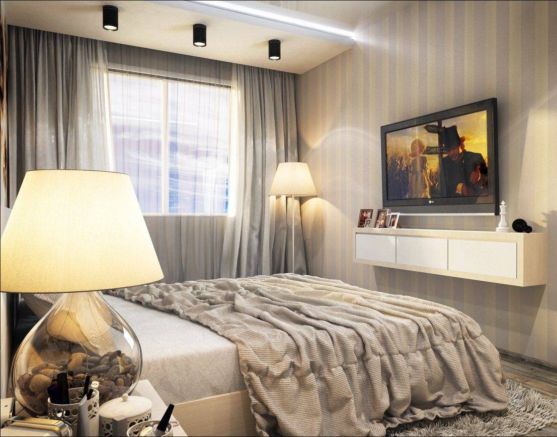 Если спальня небольших размеры лучше всего вообще воздержаться от установки телевизора, ведь большое количество приборов, особенно в малом пространстве, негативно сказывается на качестве сна и отдыха.