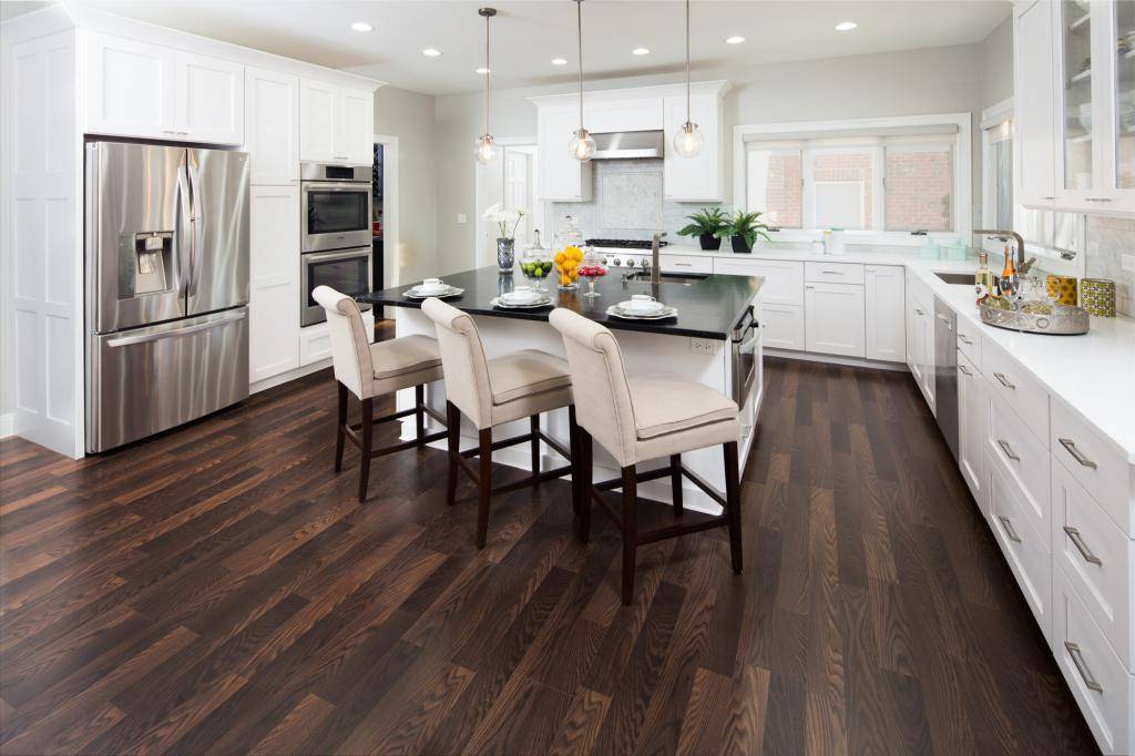 Кухня с темным полом выглядит роскошно и элегантно. Часто