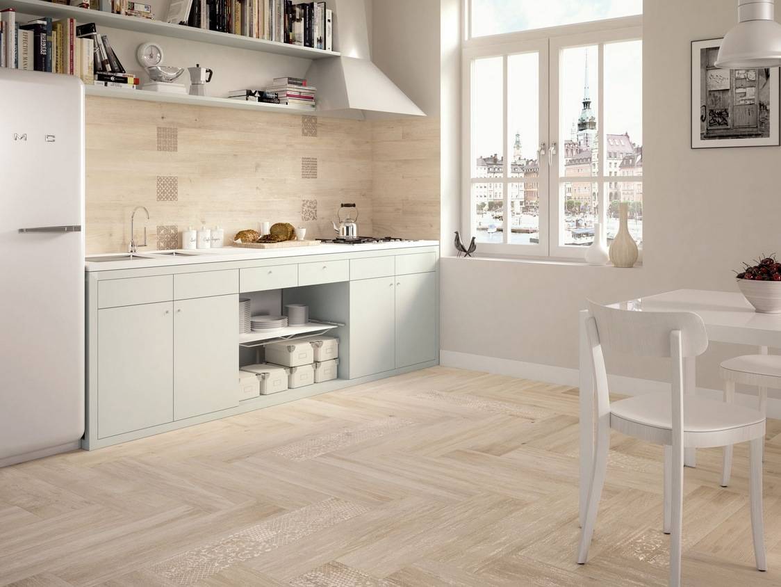 Деревянный пол будет определенно теплым и не только визуально, но и физически, на ощупь. Древесина также имеет хорошую звукоизоляцию, выглядит наиболее натурально из всех типов полов. Обустройство деревянным полом несет в себе признаки комфорта. На кухне можно пролить что-либо на пол, упадет острый предмет, поэтому поверхность должна быть устойчива к влаге и механическим повреждениям.