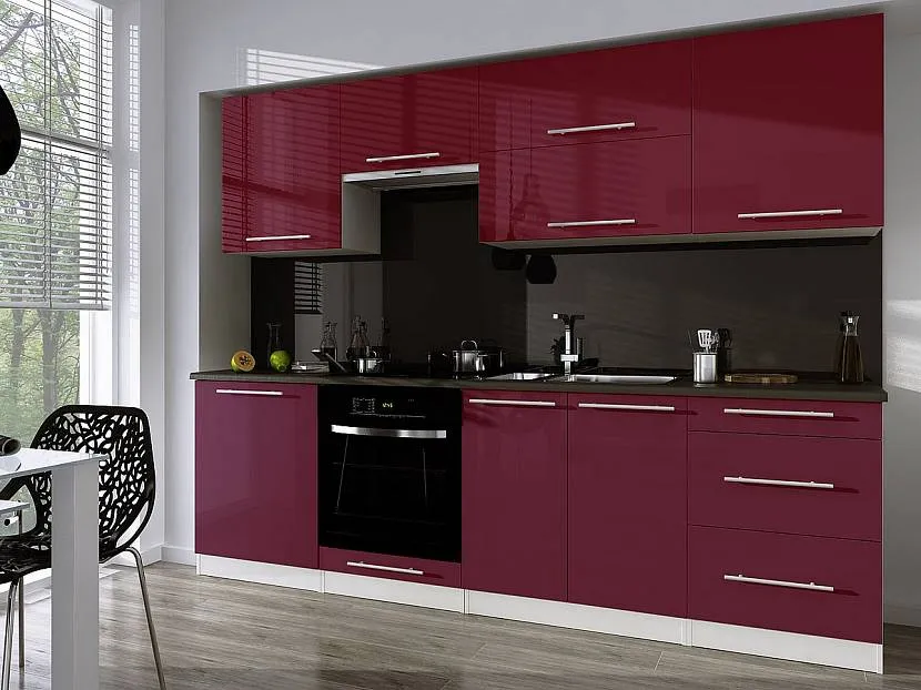 Это действительно очень красивый и очень наполненный вариант. Он модный, но классический, он свежий, но не холодный. Такое сочетание цветов подойдет даже для маленькой кухни или кухни-студии. А благодаря яркому фиолетовому цвету Вы легко сможете отделить кухонную зону и разграничить пространство.