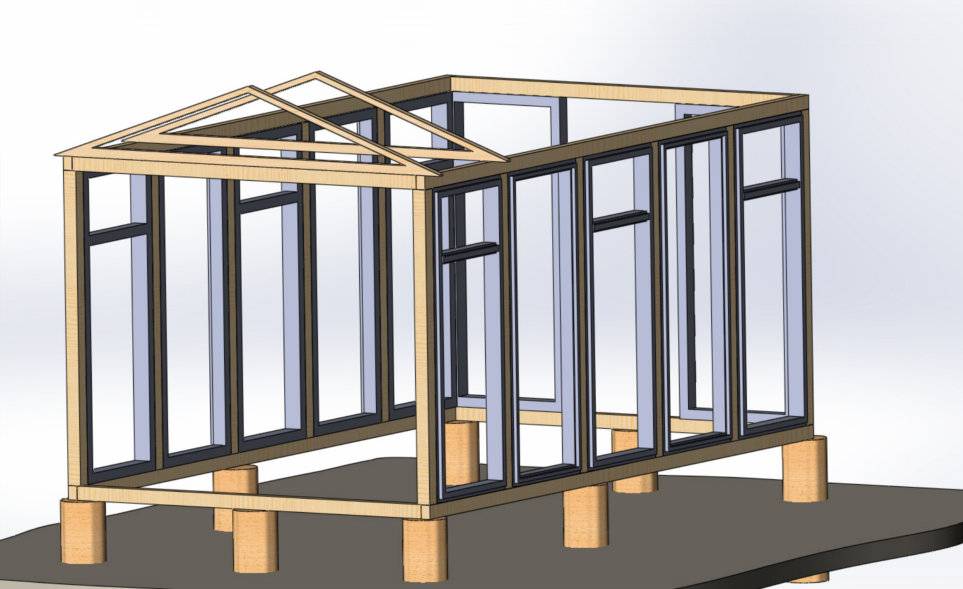 Конечно же, отдельные оконные рамы можно крепить непосредственно друг к другу, но чтобы получить прочную, надёжную конструкцию, необходимо предварительно собрать каркас из деревянных реек сечением не менее 50х30 мм. Такое решение значительно увеличит жёсткость сооружения, а значит, уменьшится опасность повреждения окон при деформации рам во время монтажа и в процессе эксплуатации. Ещё одним фактором в пользу деревянного каркаса является простота установки дверей и существенное упрощение конструкции крыши, поэтому отказываться от прочного остова в целях экономии не стоит — в дальнейшем это решение оправдает себя многократно.