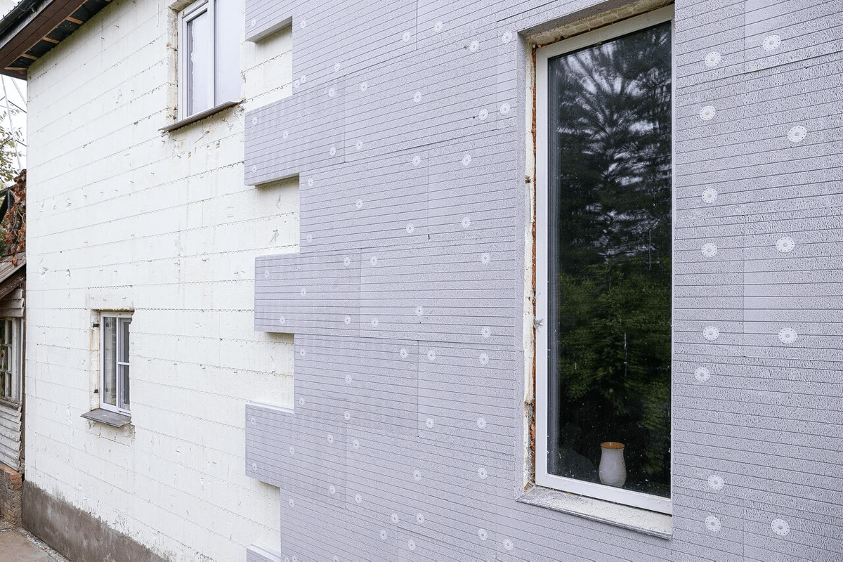 Так выглядит фасад дома, обшитый XPS ТЕХНОНИКОЛЬ CARBON ECO FAS, — получилась ровная жёсткая поверхность, на которую будет просто крепить фасадную плитку