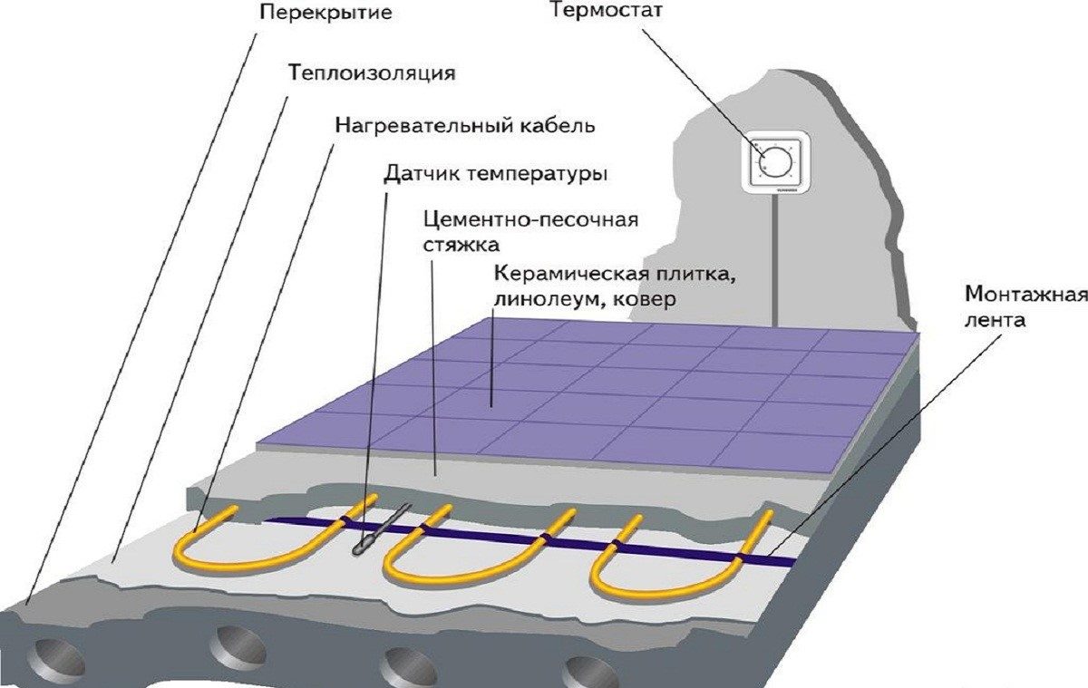 Электрический кабельный теплый пол на кухне обладает массой преимуществ:
