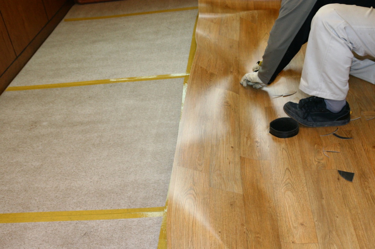 Линолеум укладывают по стандартной технологии. Покрытие расстилается по периметру комнаты и оставляется на 1-2 суток. Затем, в помещениях с маленьким метражом, края закрепляются плинтусами. В больших помещениях линолеум необходимо приклеить.
