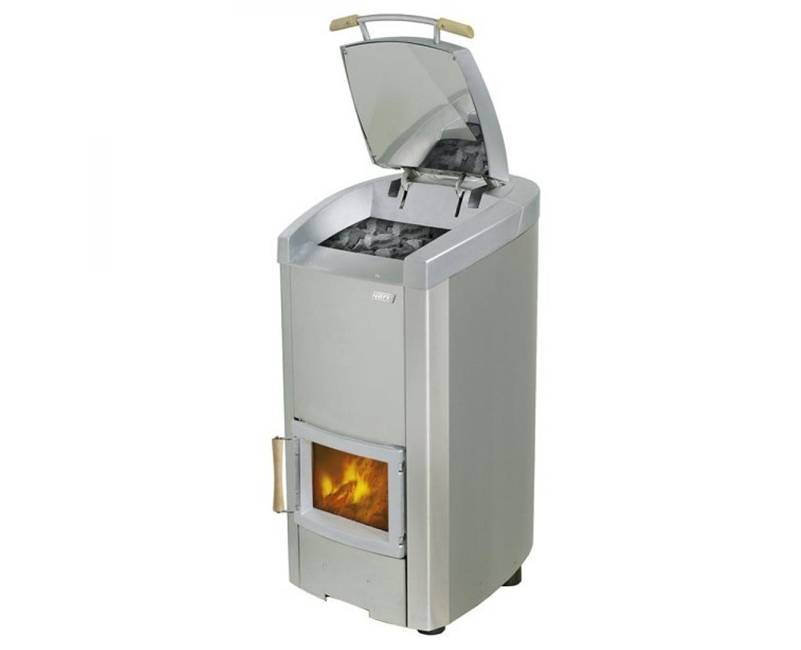 Компактная модель комплектуется небольшим (25 л) резервуаром для нагрева воды (кран расположен на фасаде прибора). Он может располагаться справа или слева. Мощность каменки составляет 19 кВт. Для небольших парных эта модель может считаться оптимальным вариантом. Она эффективно и экономично работает. Оптимизация каменки, двойная циркуляция огня и дожиг выделяемых газов помогают снизить расход дров. Производители добились существенного улучшения выброса вредных газов в атмосферу.
