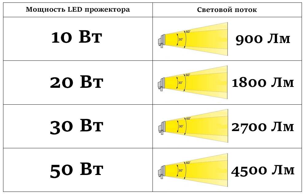 Мощность – второй важный критерий при подборе будущего светодиодного прожектора. Чем меньше она, тем экономичнее прожектор, но менее ярким будет свет.