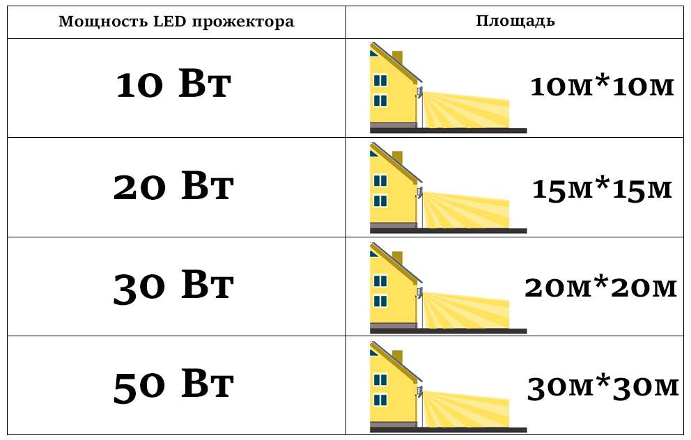 Прожектор на 200 Ватт подсвечивает территорию в 25 метров. 400 Вт подойдет для 50 метров. При этом галогенная лампа мощностью 500 Вт и светодиодная лампа на 50 Вт – одно и то же в плане мощности, но разные по дальности освещения.