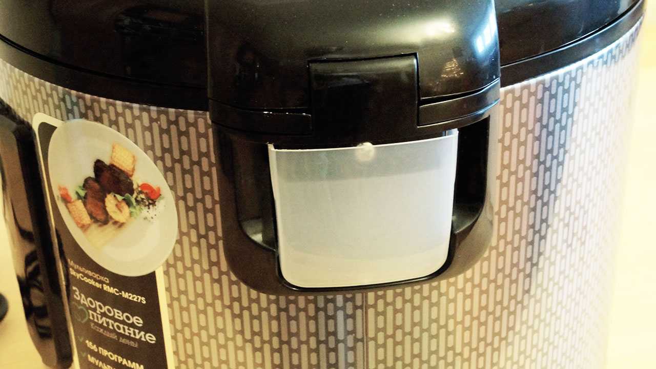 Мощность этой мультиварки 860 Вт, так что она справится с любой задачей по готовке. Сбоку есть специальный контейнер, который собирает конденсат и тем самым не дает попасть ему на детали мультиварки. Значительным минусом, который, почему-то не продумали производители, является верхняя крышка и резинка, которые вообще не снимается.